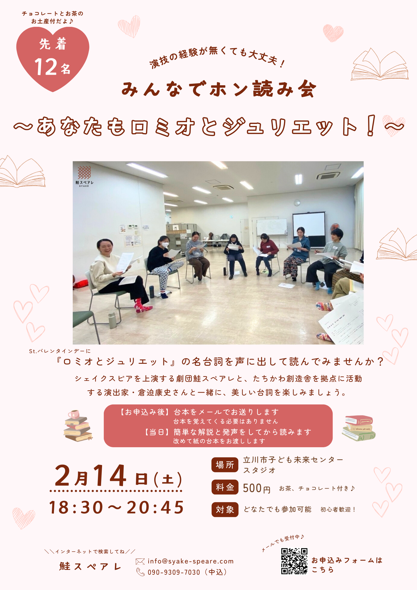 シェイクスピアを連続上演している鮭スペアレが、たちかわ創造舎を拠点に活動する演出家・倉迫康史さんと一緒に、シェイクスピアの美しい台詞を声に出して読む会『みんなでホン読み会〜あなたもロミオとジュリエット!〜』を開催します。
