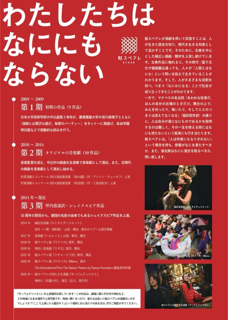 鮭スペアレ版『リチャード三世』はコロナ禍で初演しました。2025年、その制限から解き放たれた鮭スペアレが、客席と舞台が混ざりあうような臨場感溢れる空間で、生演奏と「ウタイ・マイシステム」を活かしたご機嫌な新演出で上演します!シェイクスピアをよく知る方もそうではない方も上演をよりいっそう楽しめる、劇団員によるプレトークもあります。ぜひあわせてお越しください。